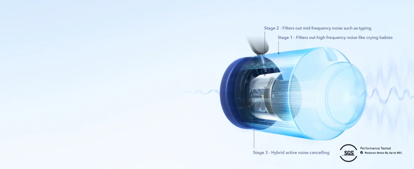 Active Noise Cancellation: Adaptive ANC (up to ~98 % reduction)