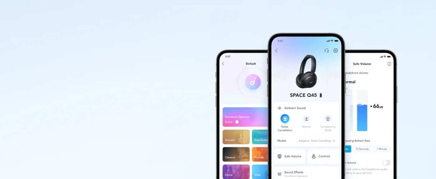 Equipped with 40 mm double-layer drivers and support for LDAC Hi-Res wireless audio, the Space Q45 delivers rich sound with deep bass, crisp mids, and clear highs. Use the Soundcore app to customize EQ settings with up to 22 presets or personalized curves for different genres.