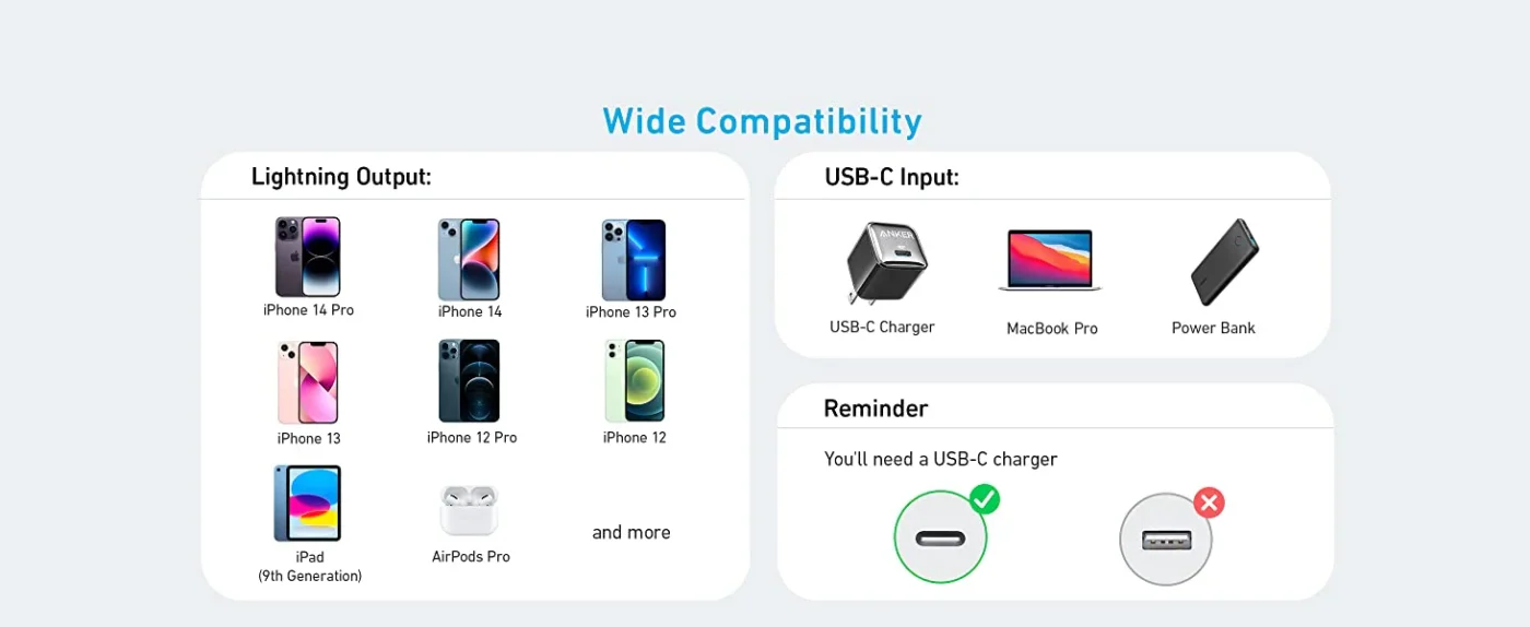 | Compatibility | USB-C smartphones, tablets, laptops, power banks |