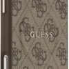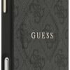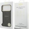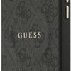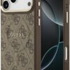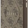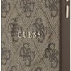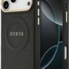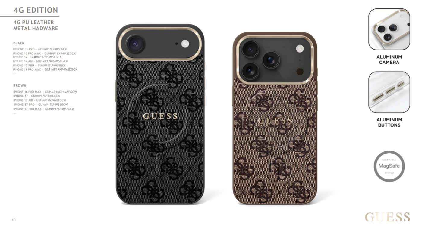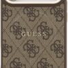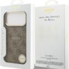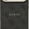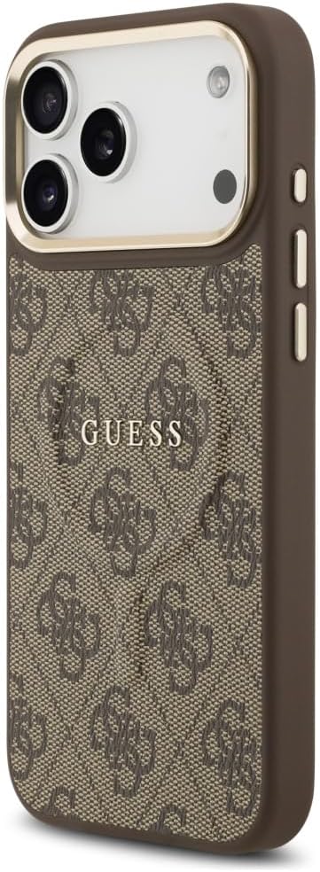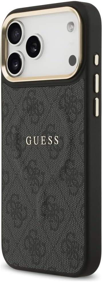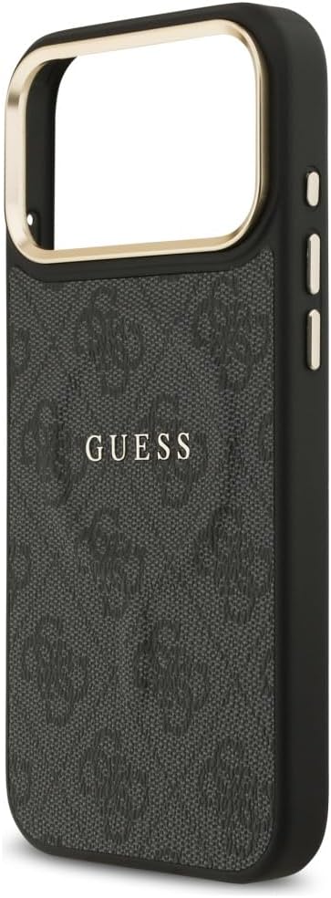 Elegant GUESS MagSafe PU leather case with 4G classic logo design and gold metal camera frame for premium style and protection.