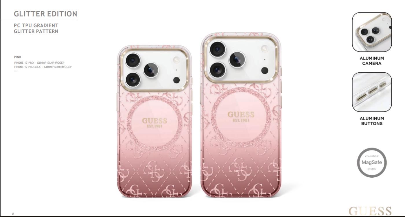 Decorated with GUESS’s iconic 4G glitter logo pattern, the case adds a luxurious sparkle while maintaining a clean, fashion-forward aesthetic suitable for everyday use.