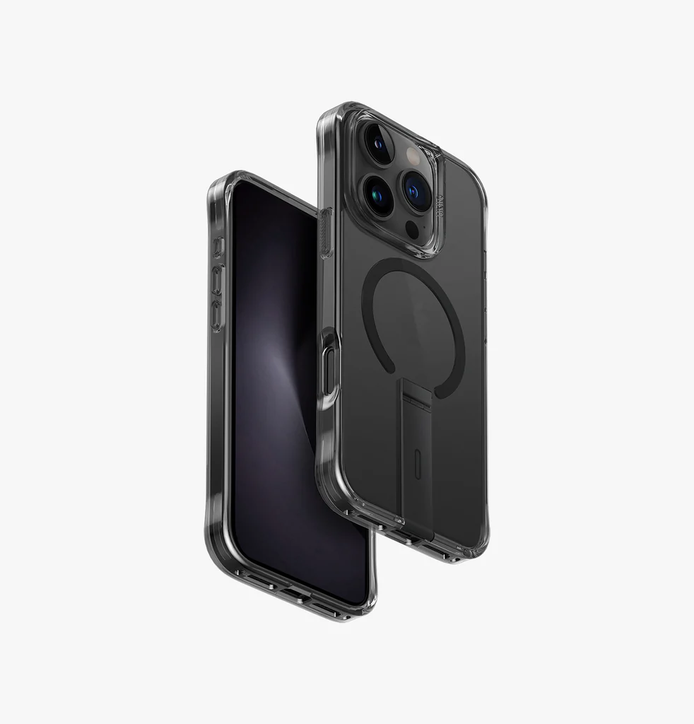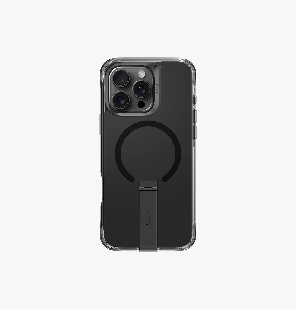 UNIQ Eleva MagClick case for iPhone 16 Pro with vertical stand, hybrid protection, and seamless magnetic wireless charging support.
