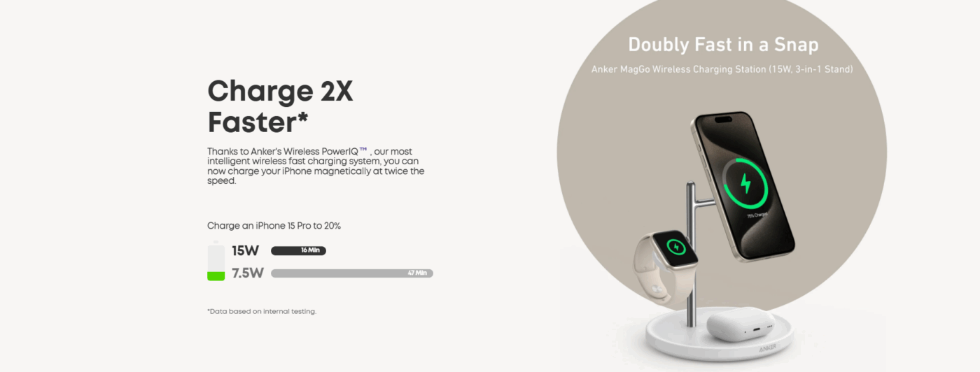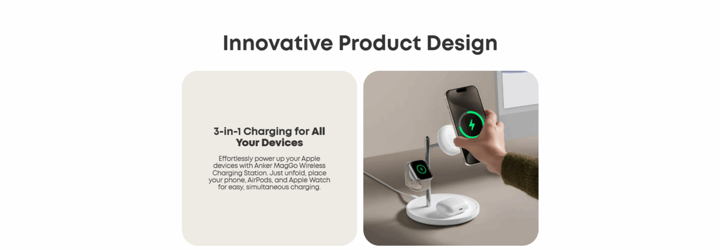 Power your entire Apple ecosystem with the Anker MagGo 3-in-1 MagSafe Wireless Charging Station Qi2 15W. It delivers faster Qi2-certified charging, supports iPhone, Apple Watch, and earbuds simultaneously, and folds for easy travel and organization.