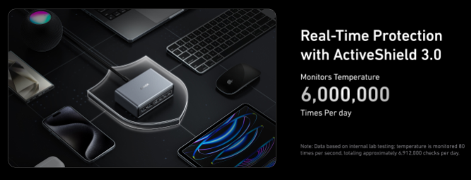 Anker Prime Charger (A2683V41) with 200W total output, 4× USB-C (100W max each), 2× USB-A, GaN tech & ActiveShield safety — charge up to 6 devices fast.