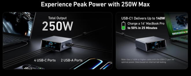 The Anker Prime 250W GaN Charger serves as a powerful desktop charging solution that delivers up to 250 W of total output across six ports — allowing you to charge multiple laptops, phones, tablets, and gadgets at the same time without sacrificing speed or efficiency.