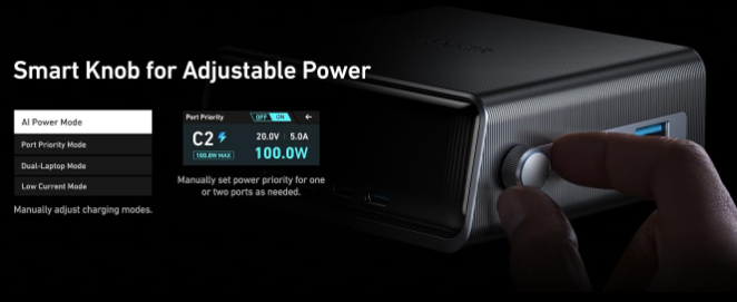 Featuring a built-in LCD display, this desktop charger shows real-time charging data and power draw, helping you see which devices are being prioritized. Paired with an intelligent control dial and GaNPrime technology, you can optimize power distribution dynamically for your connected devices.