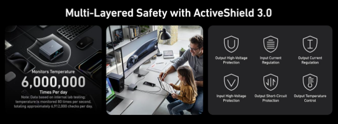 Safety is built in with Anker’s ActiveShield and PowerIQ 4.0 systems, which continuously monitor temperature, voltage and current to protect your devices from over-current, over-voltage, and overheating — making it safe for daily use with sensitive electronics.