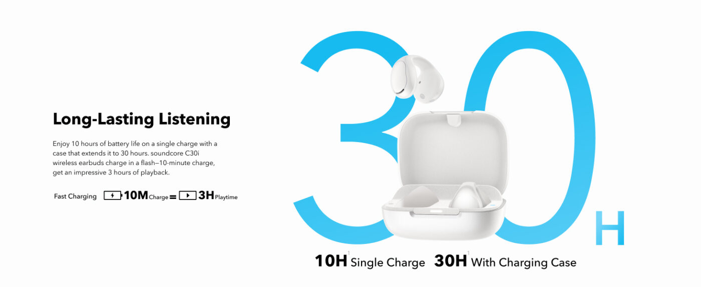 Enjoy music without interruption thanks to the C30i’s impressive 10-hour battery life per charge, with an additional 30 hours stored in the sleek magnetic charging case. When you’re in a rush, a 10-minute quick charge provides up to 2 hours of playback — perfect for busy days or spontaneous plans. Whether you’re traveling or heading to the gym, the C30i ensures your sound keeps up with your lifestyle.