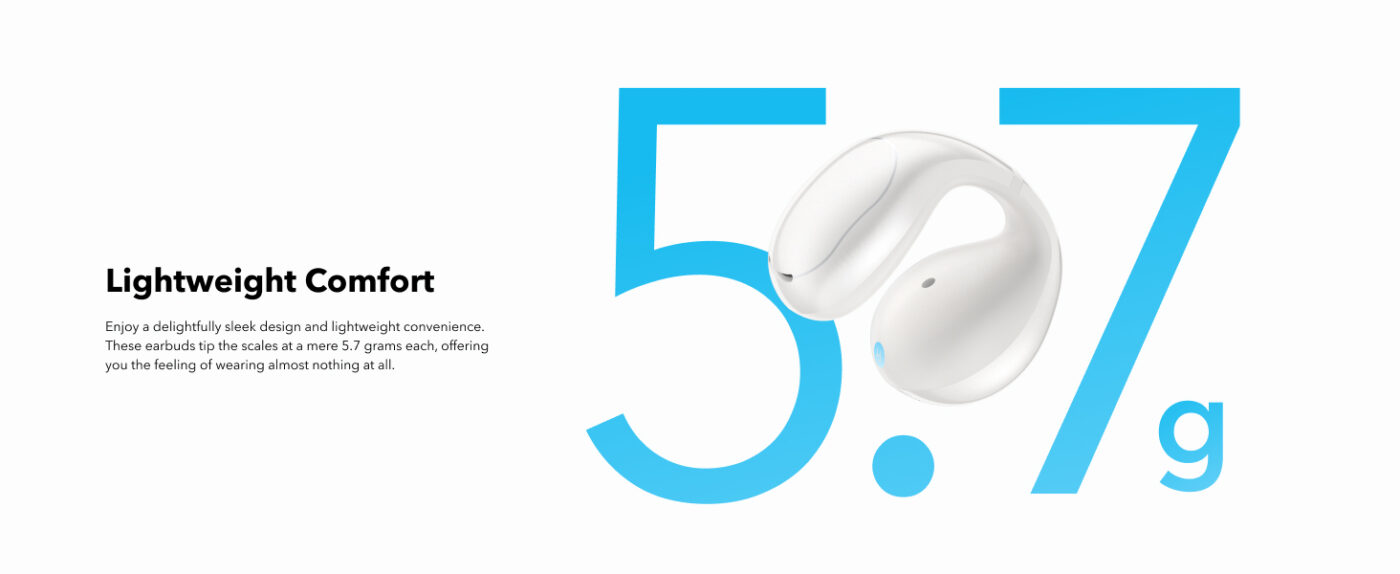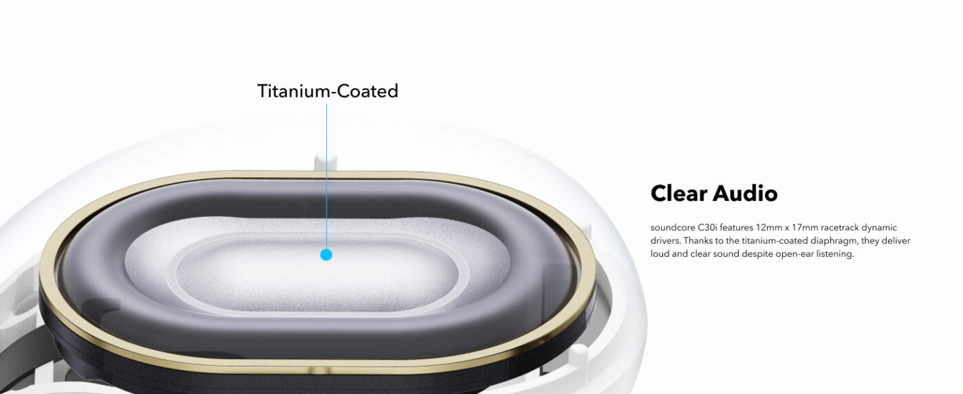 The Anker Soundcore C30i introduces a revolutionary open-ear design that redefines comfort and awareness. Unlike traditional in-ear models, these earbuds rest gently outside your ear canal, secured by a flexible and ergonomic ear clip. This ensures zero pressure inside the ear and allows you to remain aware of ambient sounds — ideal for city walks, office environments, or outdoor workouts. Additionally, the lightweight construction ensures extended listening without fatigue, even after hours of use.