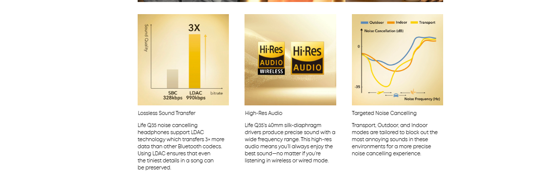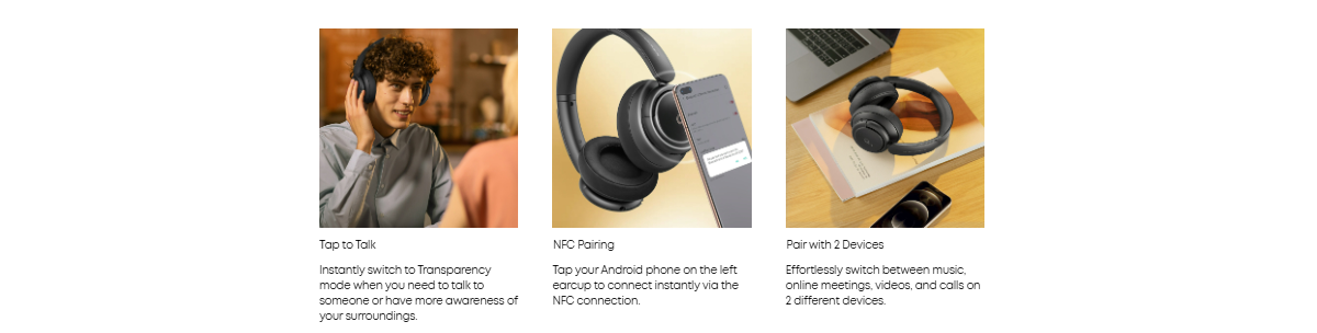 These headphones feature hybrid active noise cancelling (ANC) with multiple modes — Transport, Indoor and Outdoor — giving you tailored isolation in different environments. Whether you’re on a plane, in a coffee shop or commuting, you can shift modes and let the Life Q35 adapt. Additionally, transparency mode brings in ambient sound when you need to stay aware of your surroundings.