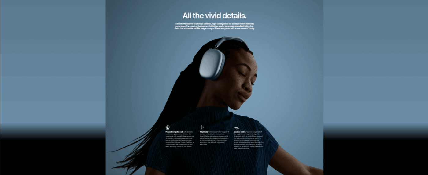 Powered by the Apple H1 chip in each ear cup, the AirPods Max deliver intelligent audio processing, low latency, and instant device pairing. The Adaptive EQ adjusts the sound in real time based on the fit and seal of the ear cushions, ensuring consistent high-quality sound.