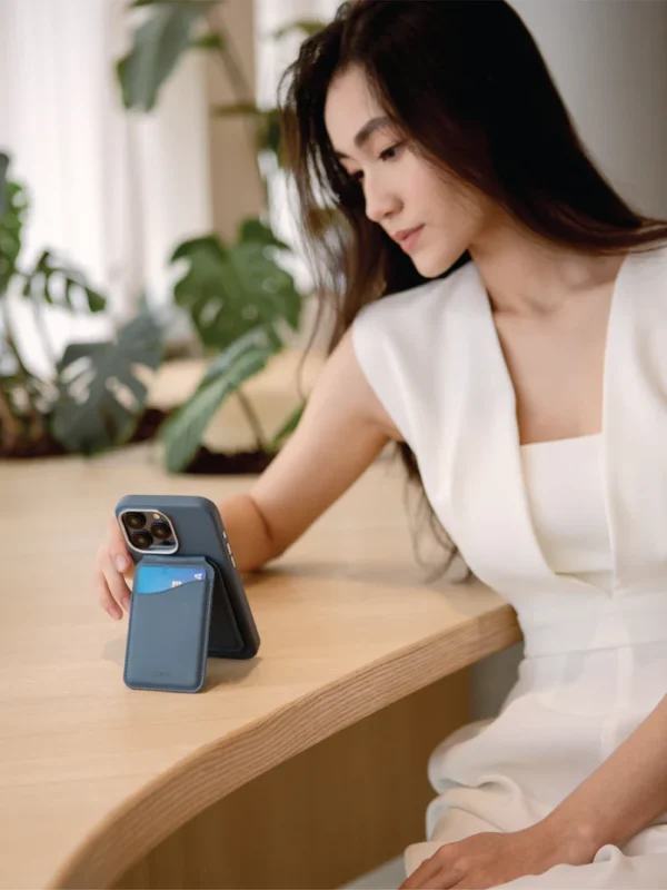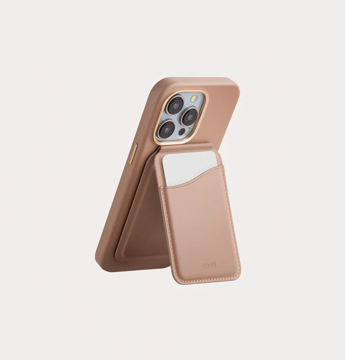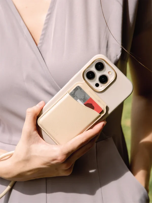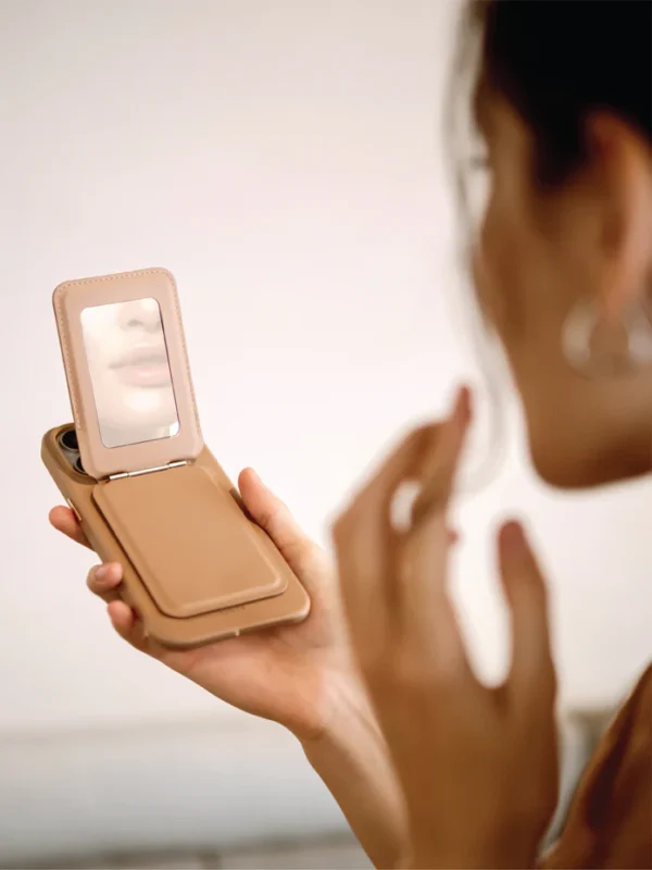 The Esme Magnetic Cardholder with Mirror and Stand features a strong magnetic system that securely attaches to MagSafe-compatible smartphones and cases. It stays firmly in place during daily use while remaining easy to remove when needed.