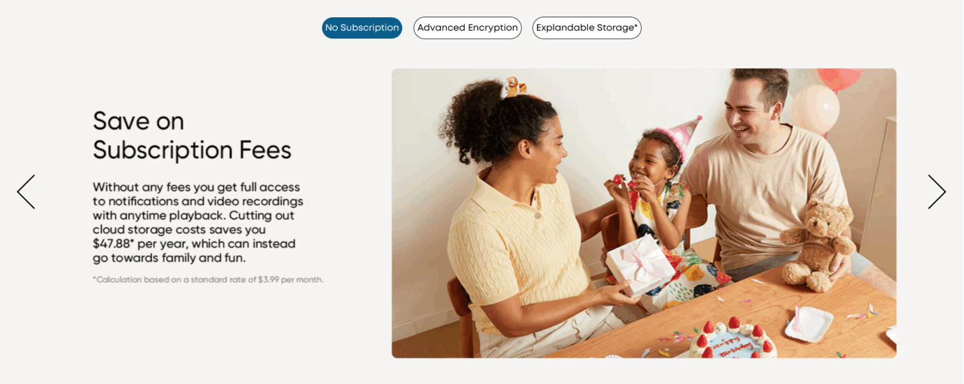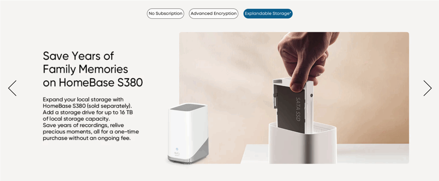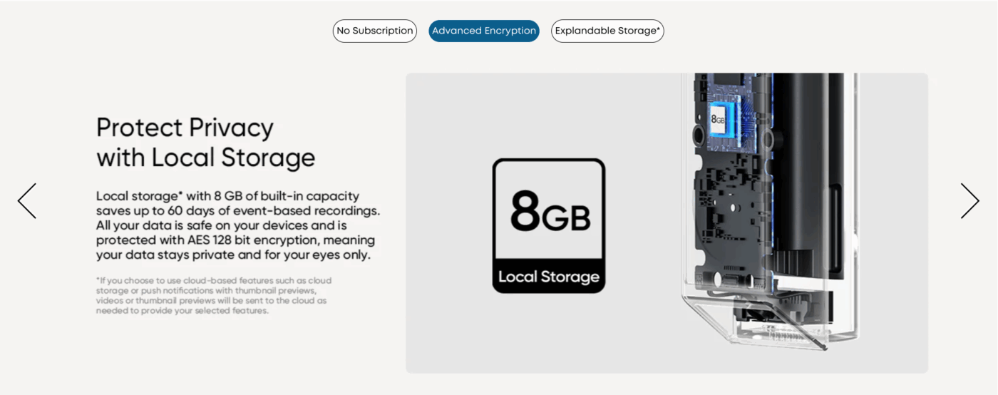 | Storage | Local Storage via HomeBase 3 (no subscription) |