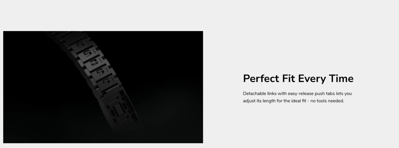 Thanks to its magnetic design, the strap offers smooth, incremental adjustment, providing a perfect fit for a wide range of wrist sizes without traditional buckles or clasps.