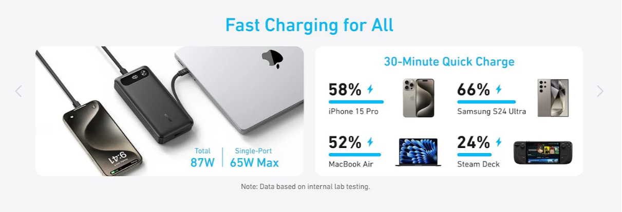 Charge two devices at once with intelligent power distribution. While one device draws 65W, the second can charge at 22W — ideal for pairing your laptop with a smartphone or tablet. Anker’s advanced PowerIQ 3.0 technology automatically adjusts output for each connected device to deliver safe and optimal charging speeds.