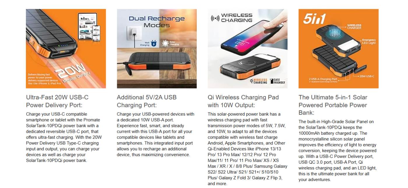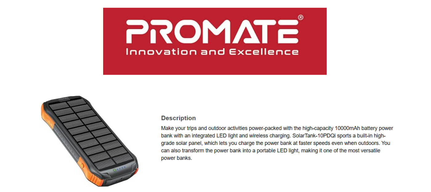 Whether you’re exploring the outdoors or preparing for unexpected power outages, the Promate SolarTank-10 ensures you stay connected with reliable and versatile charging options.