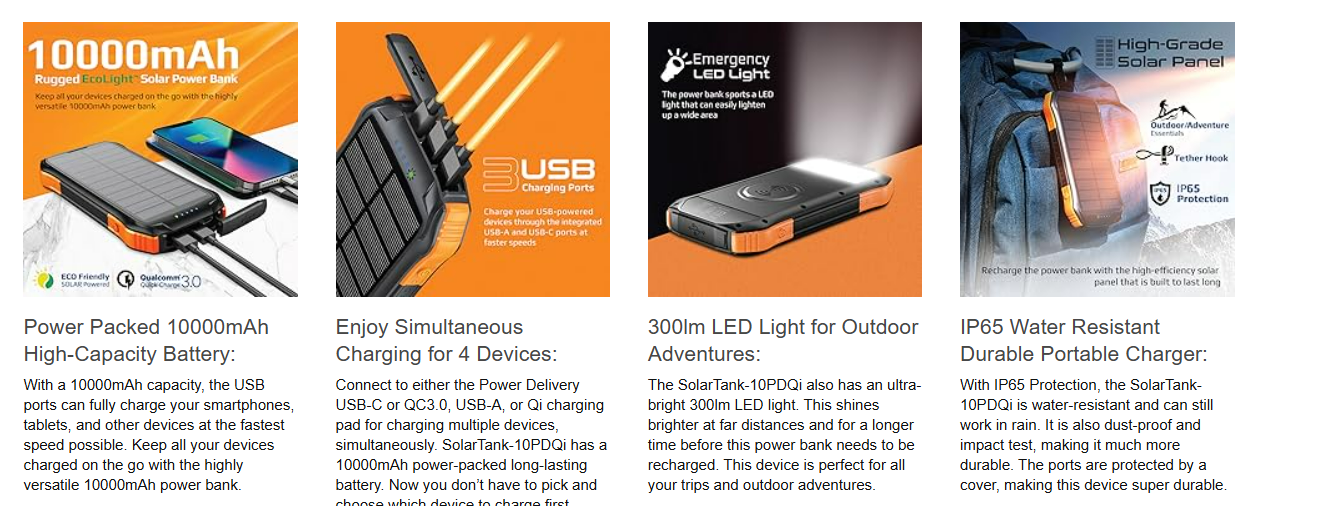 Equipped with USB-C Power Delivery technology, the SolarTank-10 delivers fast and efficient charging for compatible devices, reducing downtime and keeping your devices powered when you need them most. In addition, it supports Qi wireless charging, allowing you to charge your smartphone without cables for added convenience.