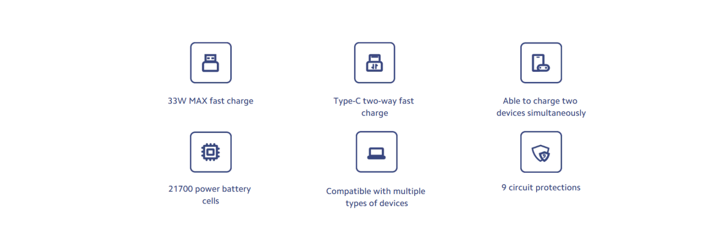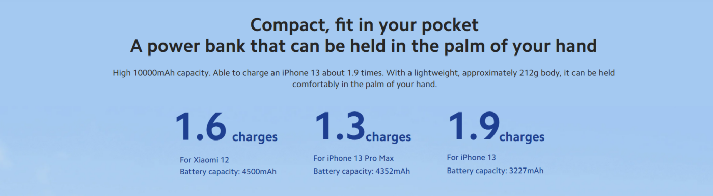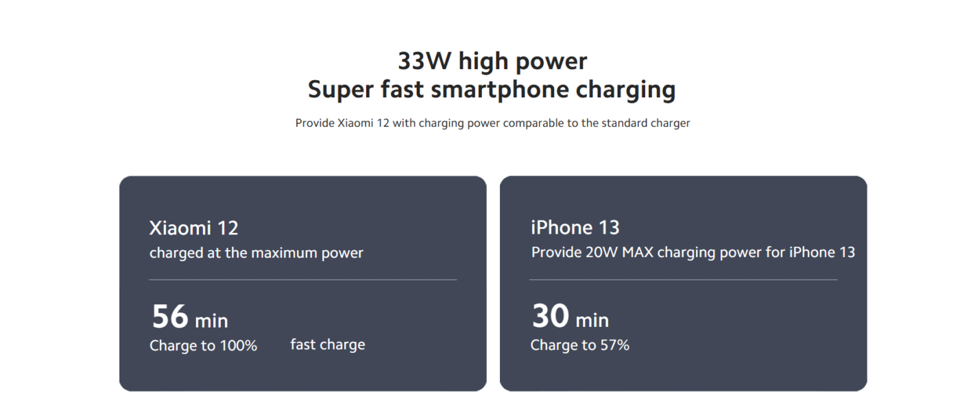 With 33W maximum fast charging, the power bank can quickly charge compatible smartphones and other devices. For example, it can fully charge a Xiaomi 12 in around 56 minutes, offering performance similar to a standard fast charger.