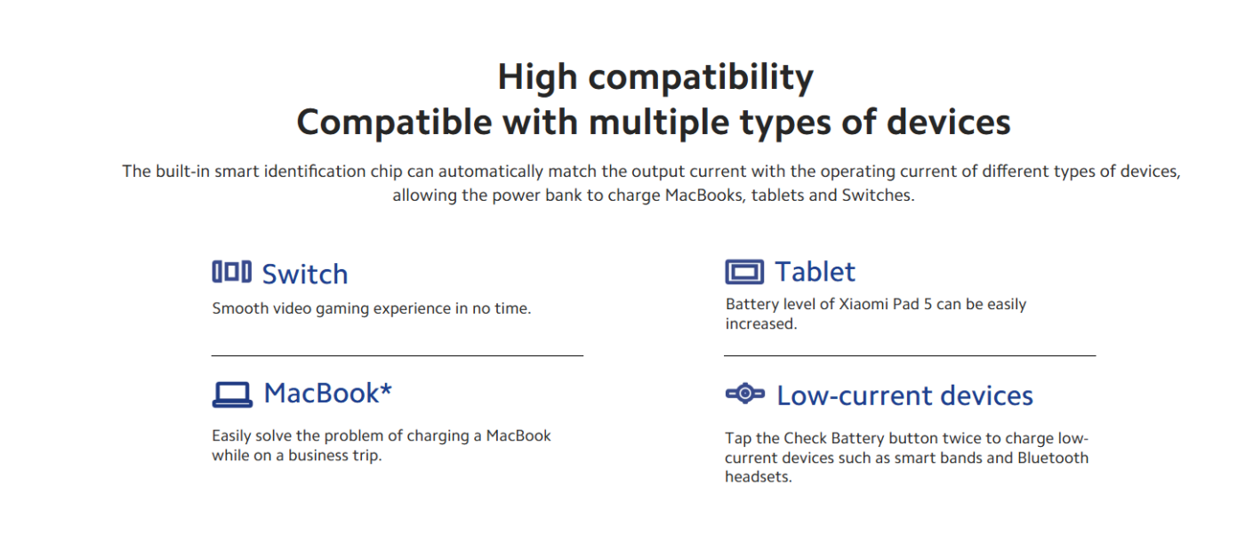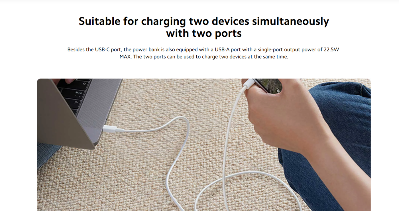 The power bank features USB-C two-way fast charging, allowing the device to both charge other devices quickly and recharge itself faster. When used with a compatible charger, the power bank can recharge fully in about 2.7 hours.