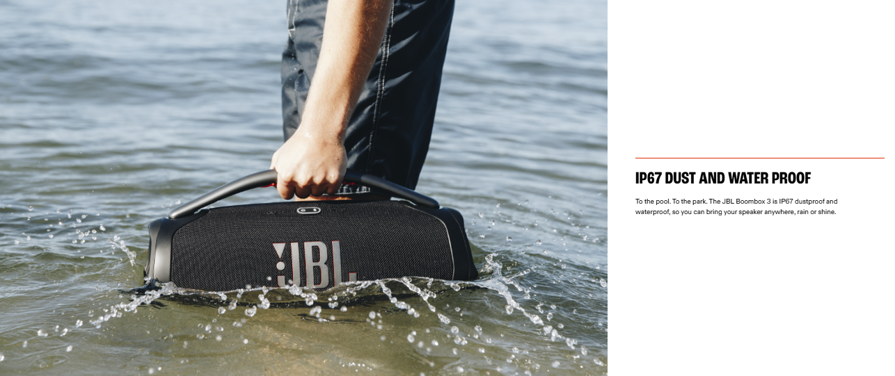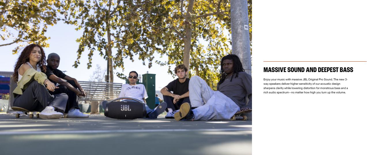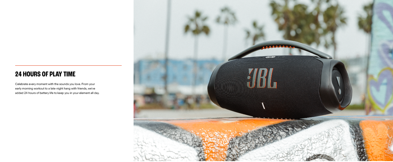 Whether you’re hosting a party or just relaxing outdoors, the JBL Boombox 3 offers massive sound, durable construction, and unstoppable battery life — all wrapped in iconic JBL design.