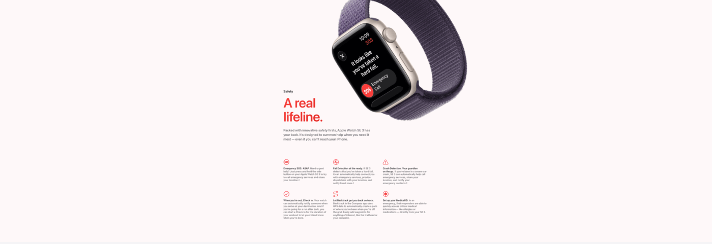 The SE3 brings powerful health and fitness tracking, including heart rate monitoring, sleep analysis, and step tracking. With Fall Detection, Crash Detection, and Emergency SOS, your safety is always prioritized.