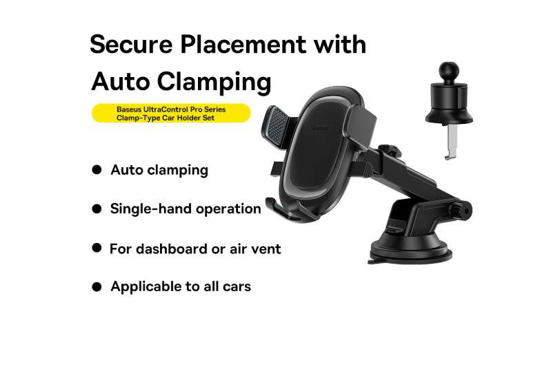 The Clamp-Type Car Holder Set comes with a multi-purpose base that can be mounted on your dashboard, windshield, or air vent. Its strong suction cup and reinforced vent clip provide maximum flexibility, making it suitable for different car interiors.