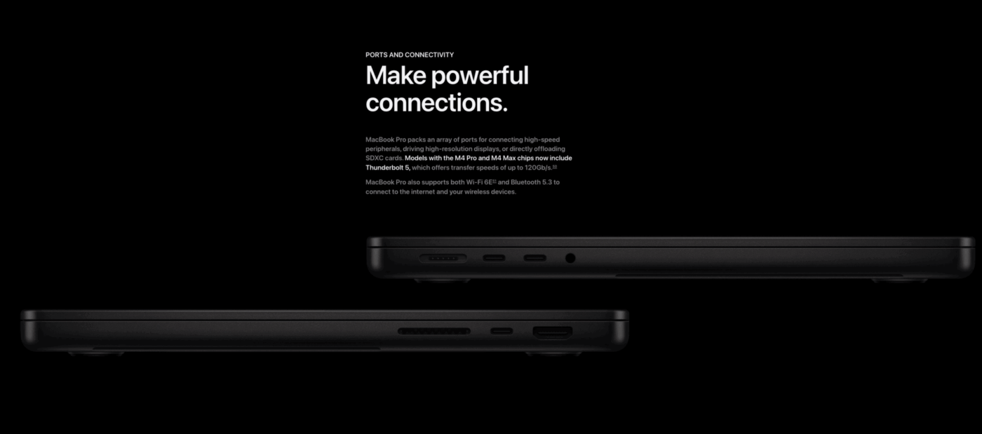 | Ports | 3× Thunderbolt 4 (USB-C), HDMI, SDXC slot, MagSafe 3, 3.5mm headphone jack |