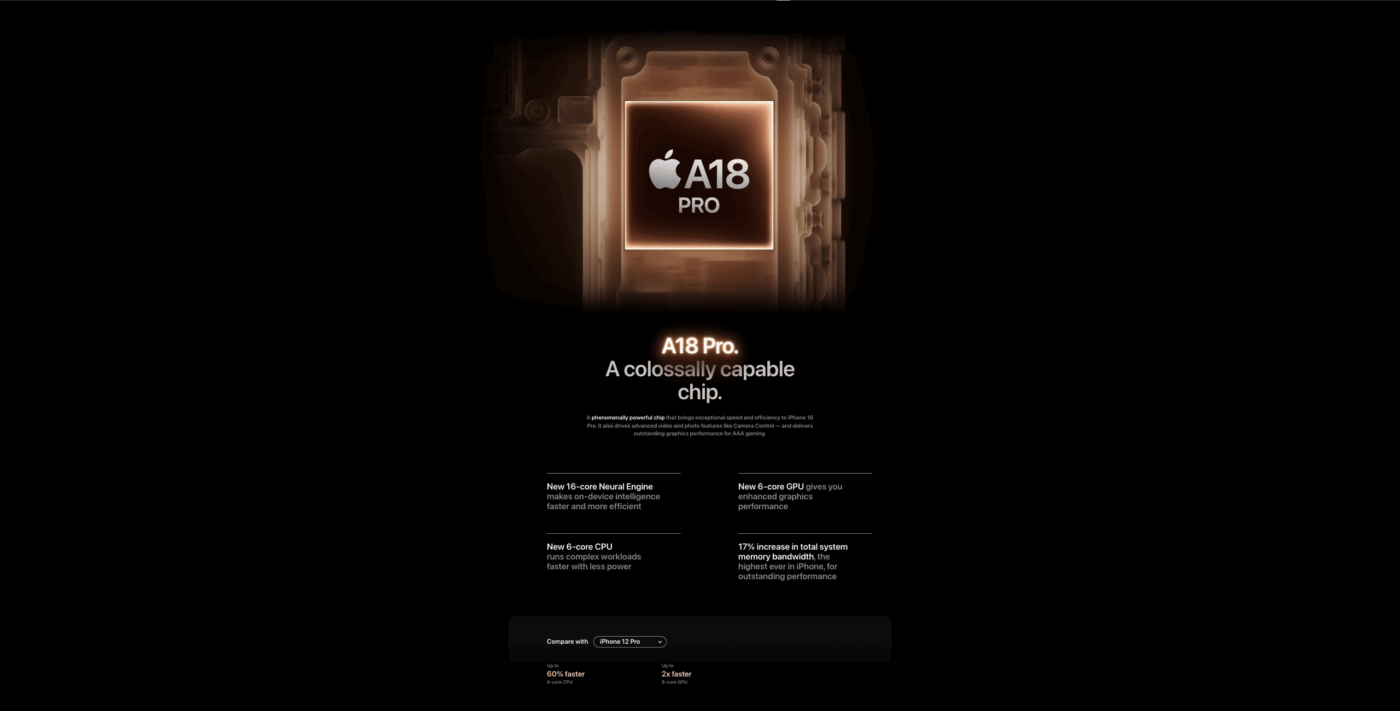 | Chipset | A18 Pro (3 nm), 6-core CPU, 6-core GPU |