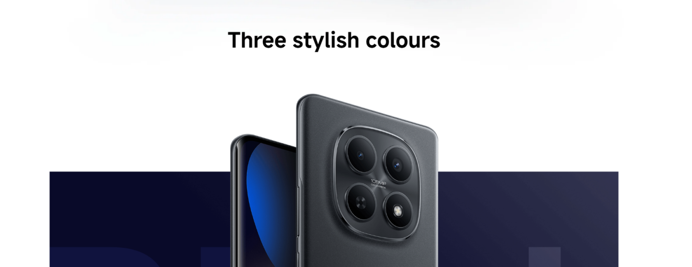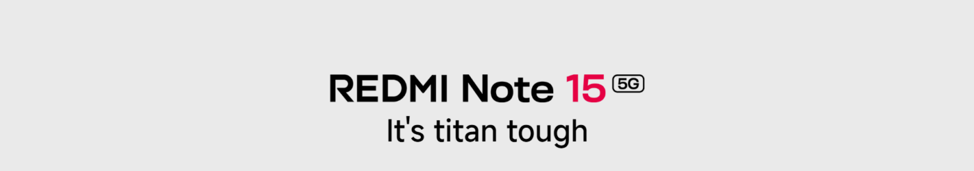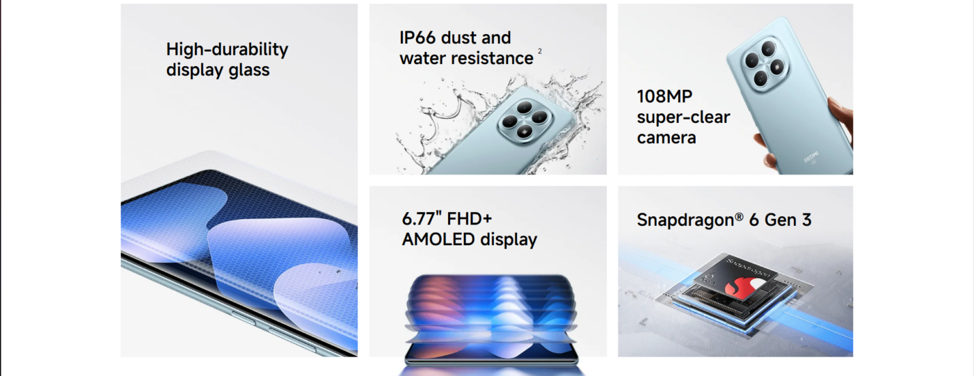 Redmi Note 15 5G with 6.77″ 120 Hz AMOLED, Snapdragon 6 Gen 3, 108 MP camera, 5520 mAh battery, 45W charging, stereo speakers, and IP66 durability.