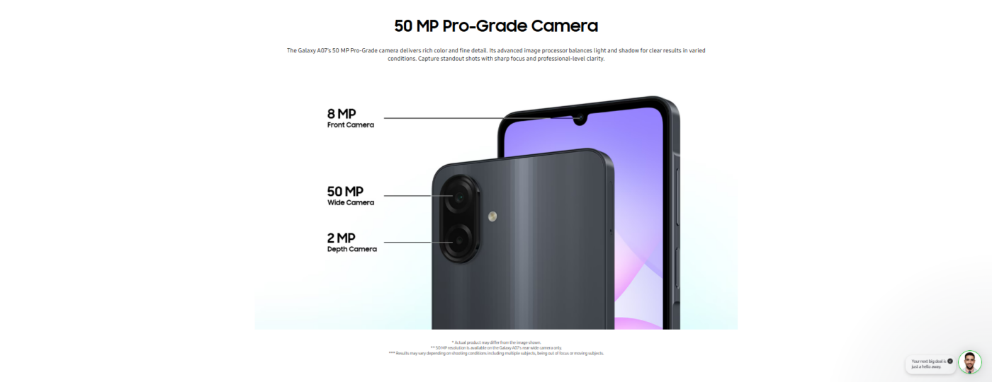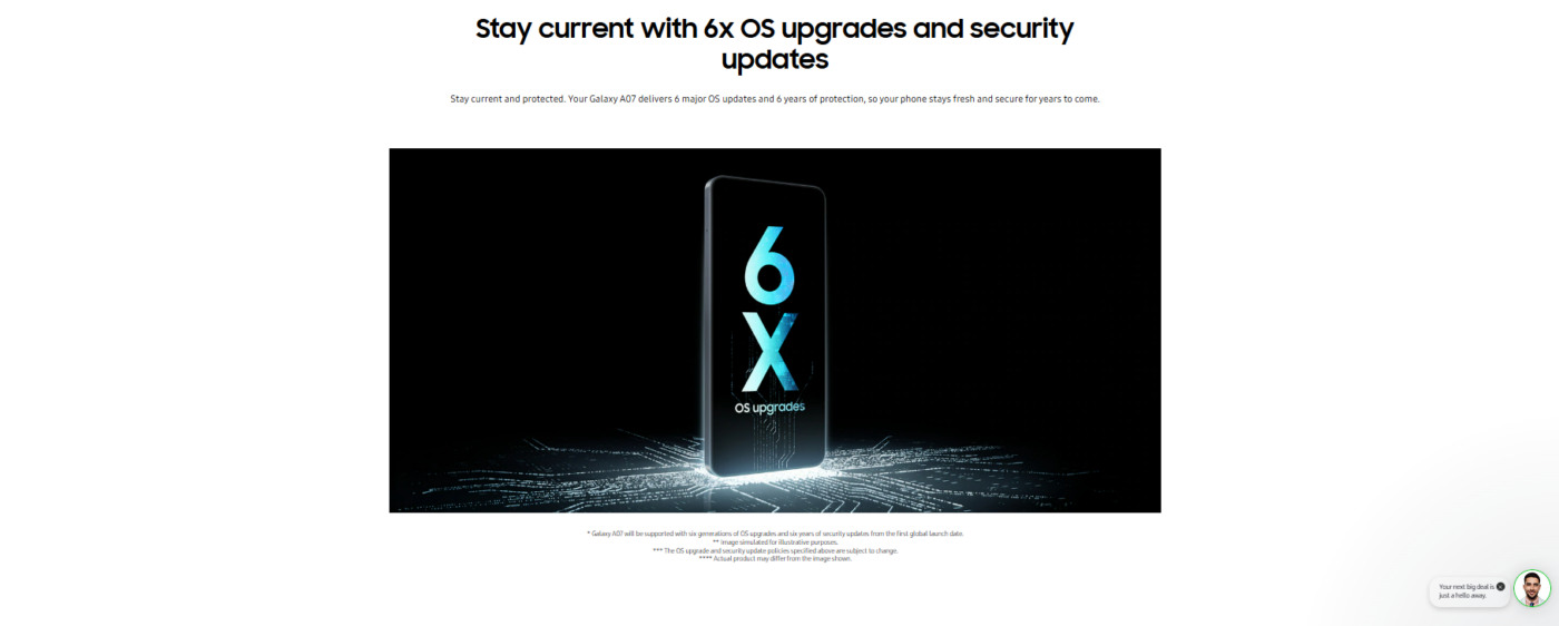 Galaxy A07 ships with Android (upgradable to the latest OneUI) and receives up to six years of OS and security updates — a significant benefit in the budget smartphone segment that keeps your phone secure and fresh over time.