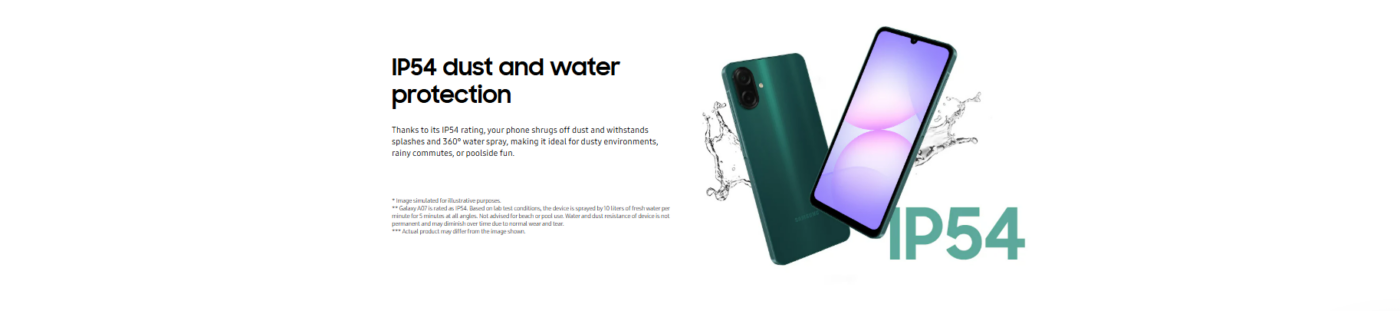 The Samsung Galaxy A07 delivers a balanced mix of performance, battery life, and usability at a competitive price point. Featuring a slim, ergonomic design with a large edge-to-edge display and an IP54 rating for dust and splash resistance, it’s built for everyday life — from browsing and streaming to light gaming and multitasking.