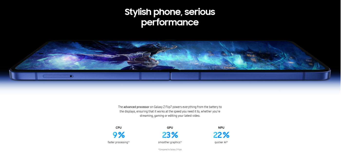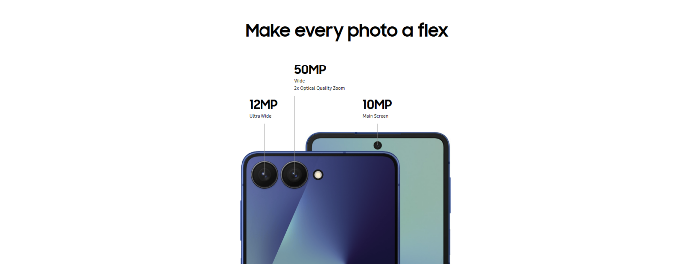 Powered by the Exynos 2500 octa-core chipset and paired with 12 GB RAM, the Galaxy Z Flip7 delivers smooth performance across social apps, multitasking, streaming, and gaming. Storage options include 256 GB and 512 GB of fast internal storage, so you have room for photos, videos, and apps.