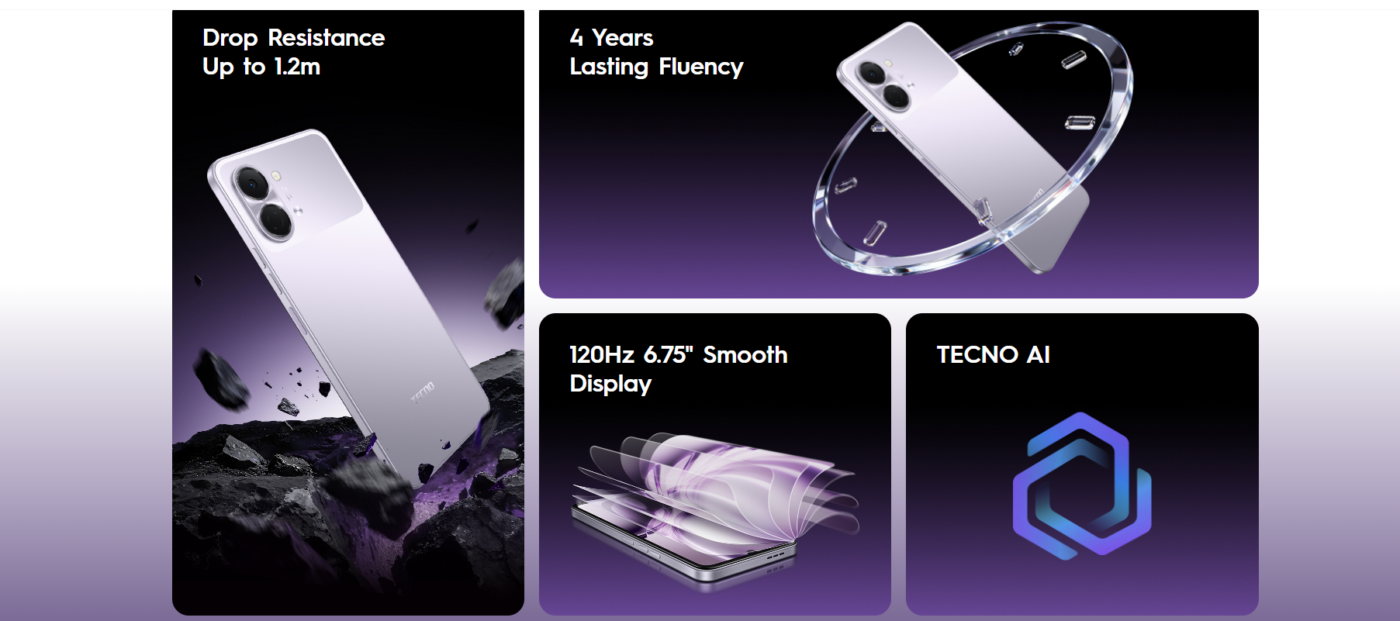 Running Android 15 with HiOS, the device brings a modern, intuitive interface with helpful tools like voice assistance (Ella AI in some regions), smart camera modes, and adaptive UI features for smooth performance and usability.