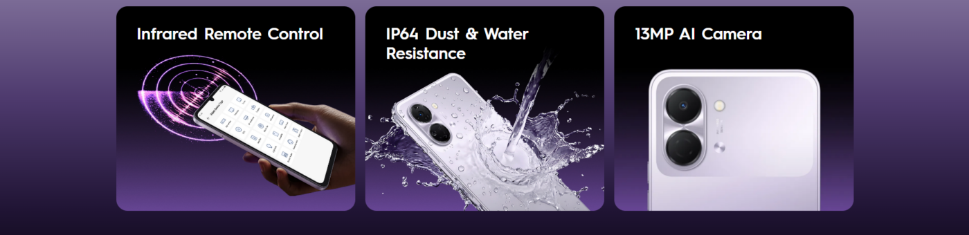 Designed for everyday use, the Spark Go 3 carries an IP64 rating for dust and splash resistance, making it resilient in daily environments. It also includes a side-mounted fingerprint sensor for secure unlocking, an infrared remote control for home device interaction, and common connectivity features like Wi-Fi, Bluetooth, GPS, FM radio, OTG, and dual SIM support.