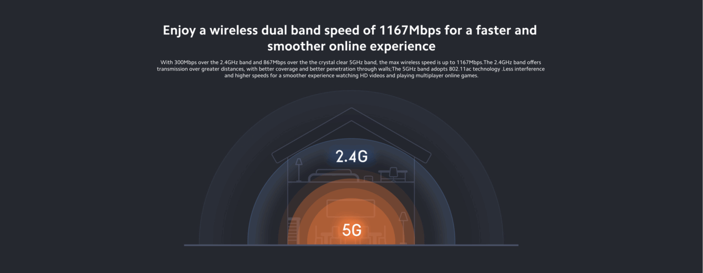 The Mi Router 4A is designed to bring reliable, high-speed Wi-Fi to your entire home. Featuring dual-band Wi-Fi technology, it provides combined wireless speeds of up to 1167 Mbps, with 867 Mbps on the 5 GHz band and 300 Mbps on the 2.4 GHz band, ensuring a seamless online experience for streaming, gaming, and smart devices.