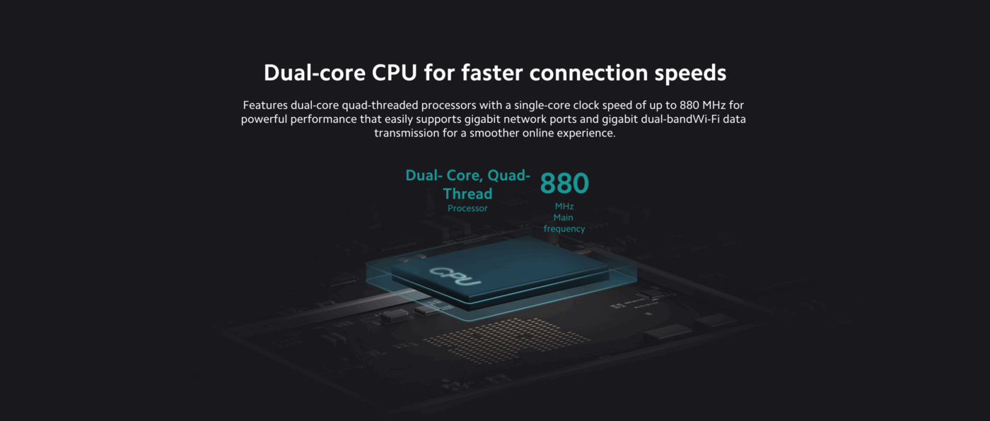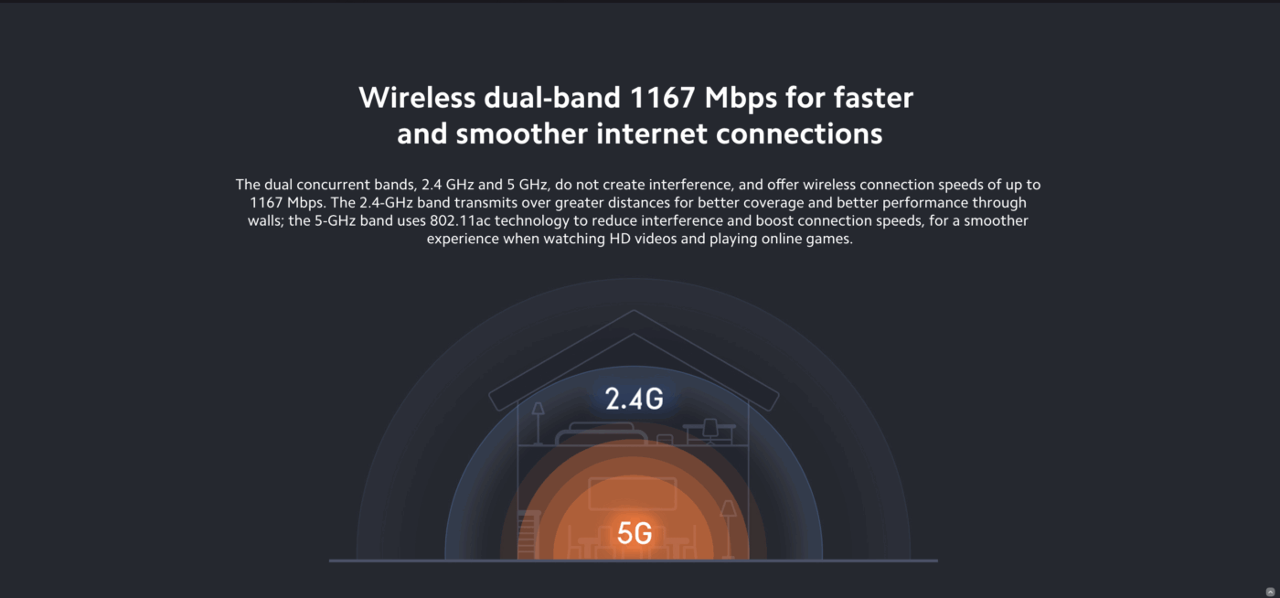 Equipped with dual-core processing power, it ensures stable performance even during heavy network usage. The router supports combined wireless speeds of up to 1167 Mbps, with 867 Mbps on the 5 GHz band and 300 Mbps on the 2.4 GHz band, ensuring strong and stable connections for every user in your household.