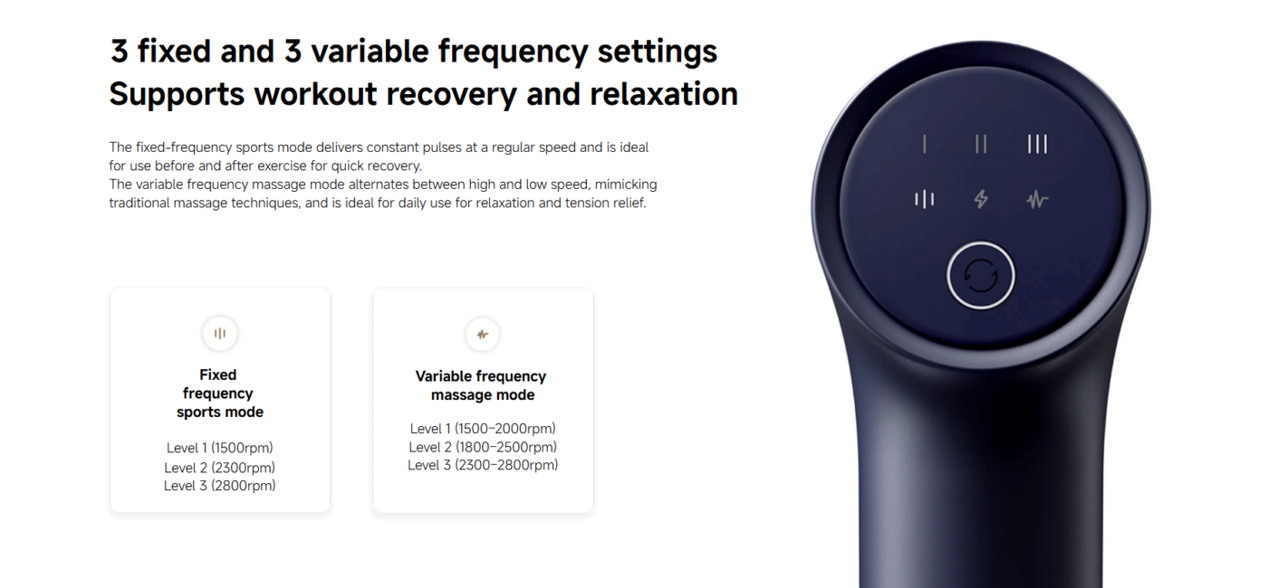 The device features multiple speed levels, allowing users to customize massage intensity depending on muscle sensitivity and recovery needs. Lower speeds are ideal for relaxation and warming up muscles, while higher speeds deliver deeper therapeutic relief for tight or sore muscle groups.
