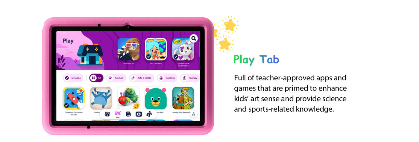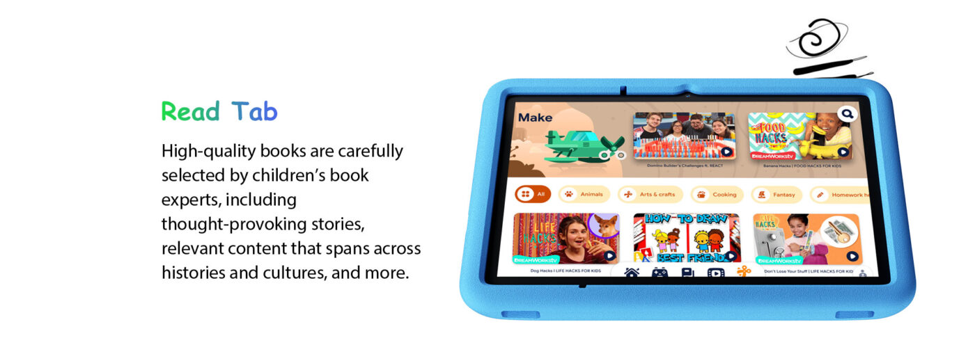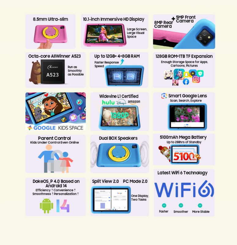 The tablet runs DokeOS 4.0, based on Android 14, offering a user interface that is intuitive and kid-friendly. With built-in parental controls, parents can set usage time limits, filter inappropriate content, monitor app usage, and create a safer digital environment.
