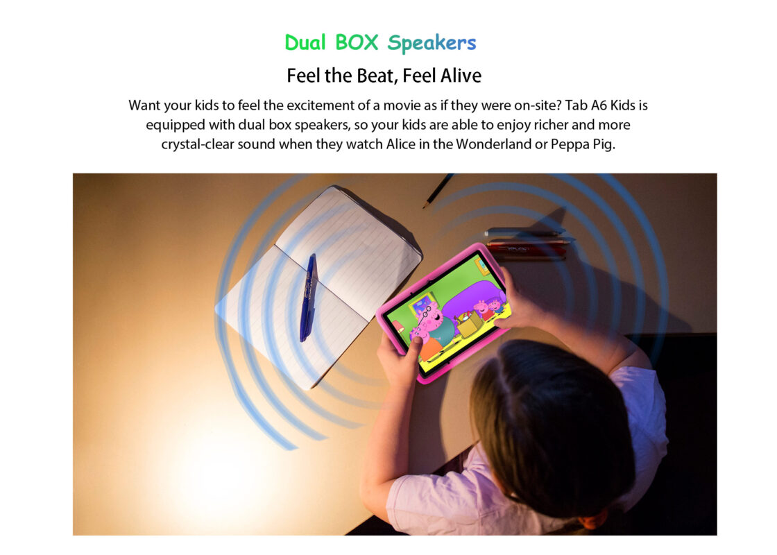 For capturing moments or video calls, the tablet includes an 8 MP rear camera and a 5 MP front camera. While these aren’t flagship-level, they are more than adequate for kids’ video chats, homework snaps, and creative play. Dual BOX speakers deliver stereo sound, giving clear audio for cartoons, music, or online lessons.