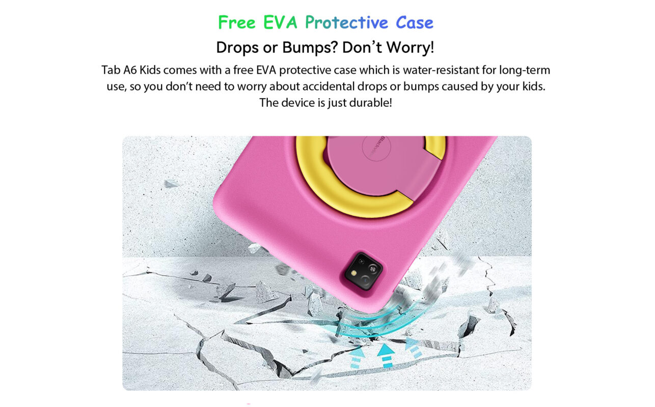 The Blackview Tab A6 Kids is a family-friendly tablet built with durability, safety, and entertainment in mind. Wrapped in a protective EVA case available in Rose Pink or Ocean Blue, it is designed to handle drops and tumbles while remaining comfortable to hold. Its chassis size is moderate: dimensions of 242.7 × 161.5 × 8.5 mm and weight of 546 grams, making it manageable for children to carry without being too bulky.