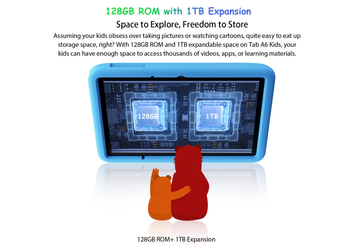Under the hood, the Tab A6 Kids runs on an AllWinner A523 octa-core processor, which provides sufficient performance for basic tasks, games, and educational apps. It ships with 4 GB RAM + 128 GB internal storage, giving ample space for apps, media, and games. Virtual RAM expansion allows boosting the RAM further (up to 8 GB in some variants), helping with multitasking. Storage can also be expanded via a microSD (TF) card up to 1 TB, giving plenty of room for video content, photos, and educational materials.