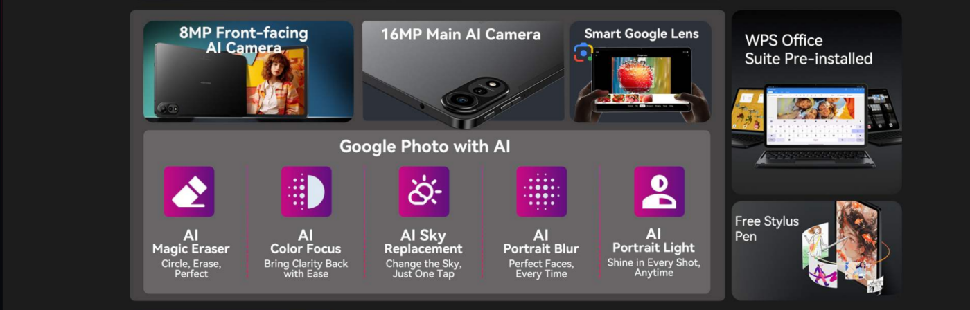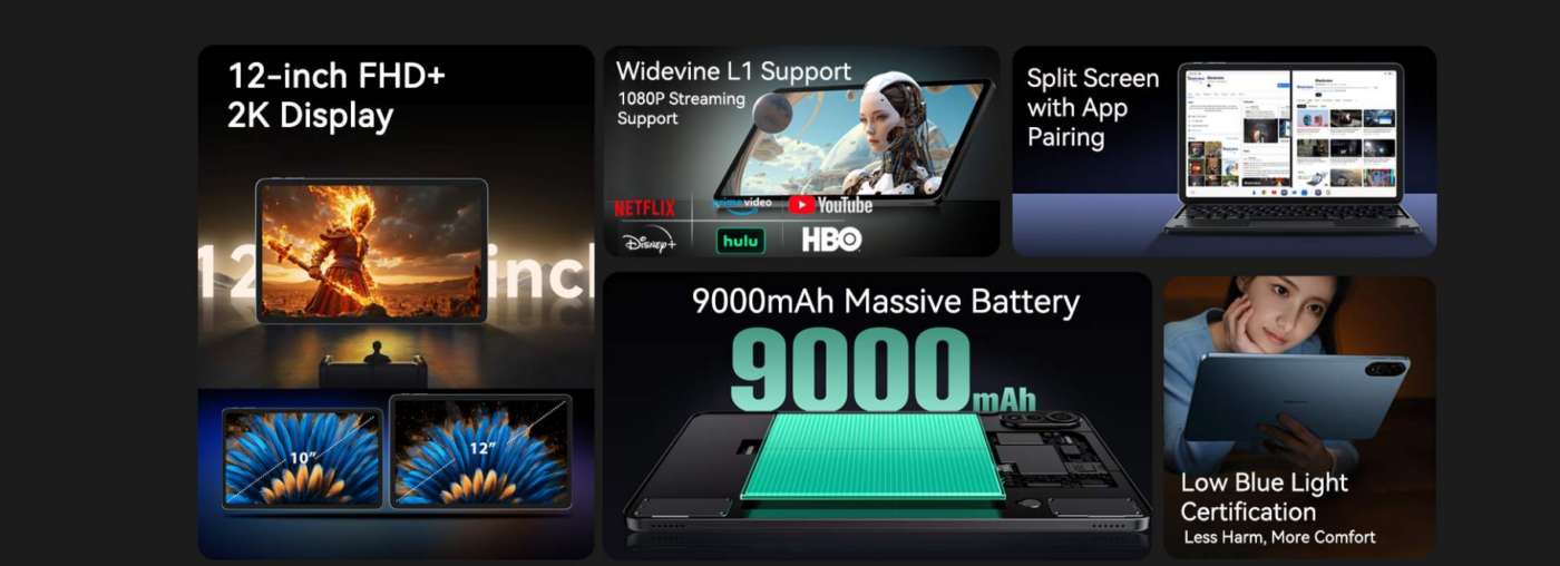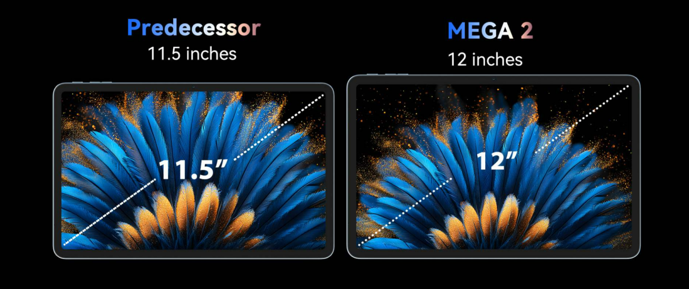 The Blackview Tab Mega 2 impresses with a 12-inch IPS LCD screen at 2000×1200 resolution, offering vibrant colors and ample space for videos, browsing, gaming, and split-screen multitasking. Its 84.9 % screen-to-body ratio enhances the viewing experience for entertainment and productivity.