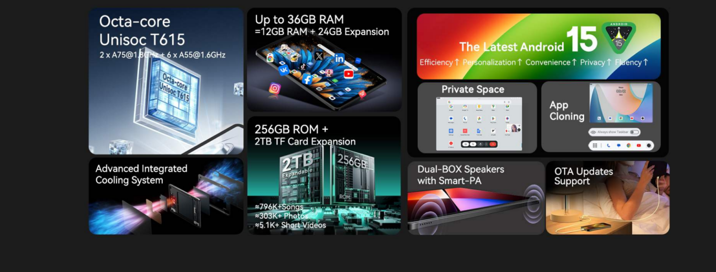 Powered by the Unisoc T615 octa-core chipset (2× Cortex-A75 + 6× Cortex-A55), this tablet handles daily tasks smoothly — from web browsing and video playback to light gaming and productivity apps. Combined with LPDDR4X RAM and UFS 2.2 storage, it delivers responsive performance for typical tablet use.